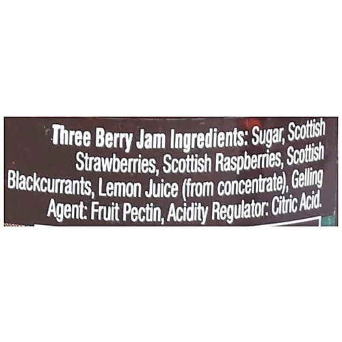 Sugar, Scottish Strawberries (19%), Scottish Raspberries (9%),Scottish Blackcurrants (7%), Lemon Juice (from concentrate), Gelling Agent: Fruit Pectin, Acidity Regulator: Citric Acid.