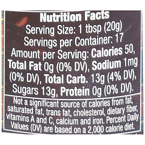 Nutrition_per: 20g Serving_Size: 20g Calories: 50 Total Fat: 0g Sodium: 1mg Total Carb.: 13g Sugars: 13g Protein: 0g